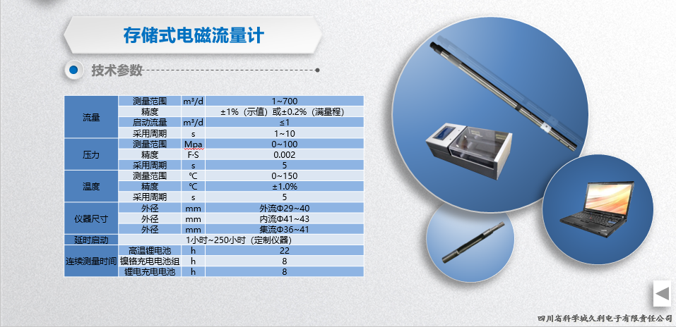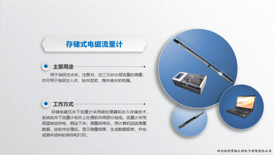 用于油田注水井、注聚井、注三元井分層流量的測量及檢漏;一次下井可同時獲取流量、磁定位、自然伽馬、流體溫度、壓力五個參數(shù),綜合解釋測試資料。