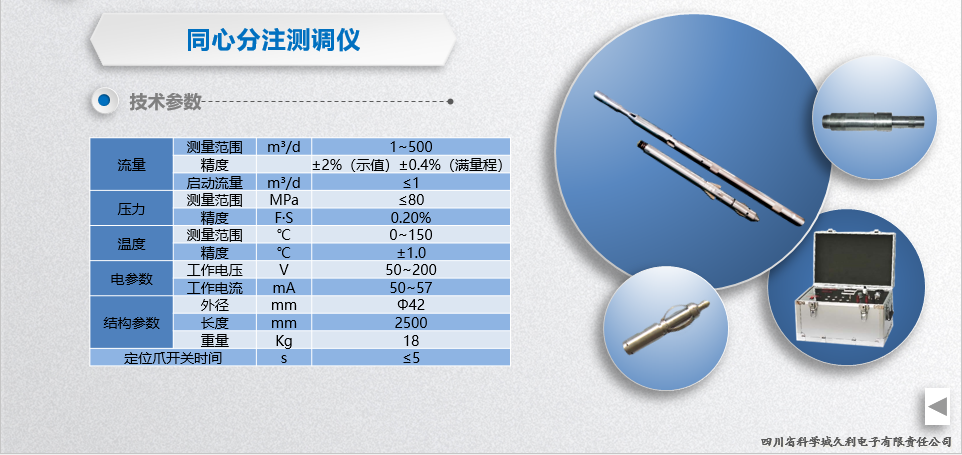 用于油田注水井、注聚井、注三元井分層流量的測量及檢漏;一次下井可同時獲取流量、磁定位、自然伽馬、流體溫度、壓力五個參數(shù),綜合解釋測試資料。